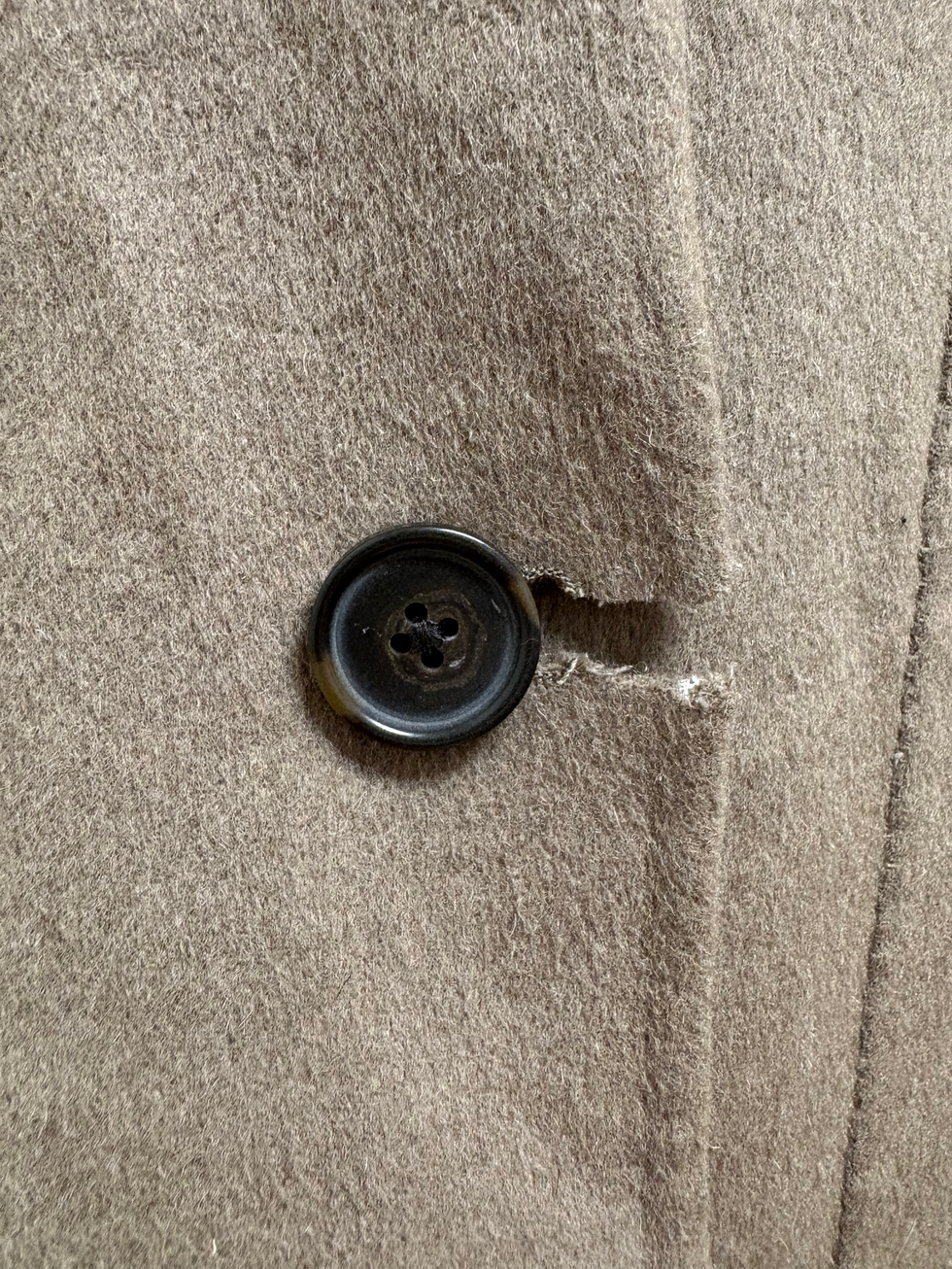 Good- Lightly worn with overall minimal signs of wear. Button hole has a rip and will need to be mended. Otherwise, great condition.
