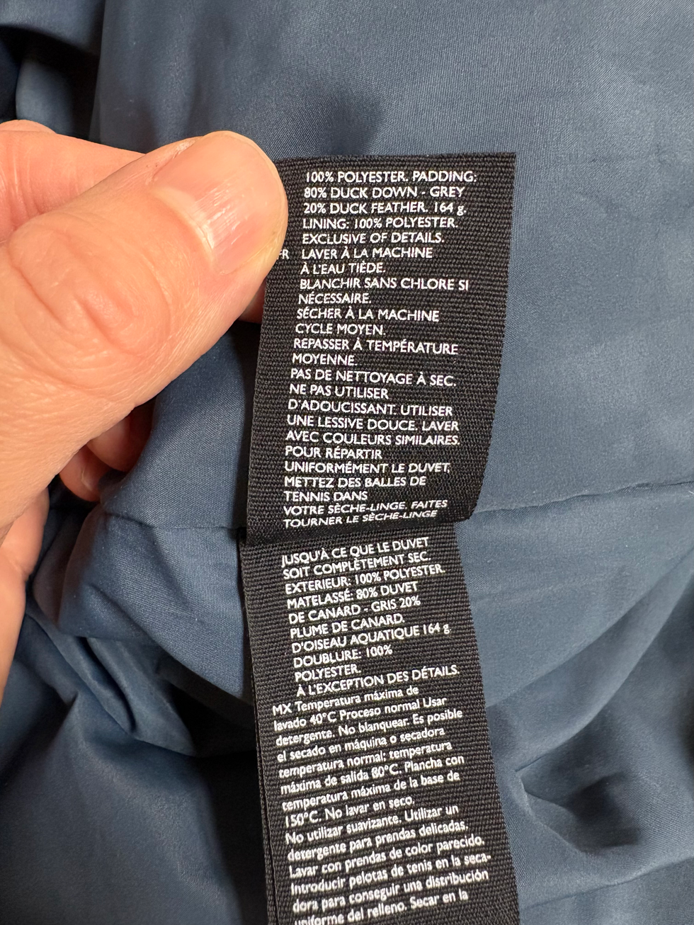 49" L, 21" W, 25.5" L sleeves from shoulder seam. 80% Duck Down. 20% Duck Feather. Polyester shell.