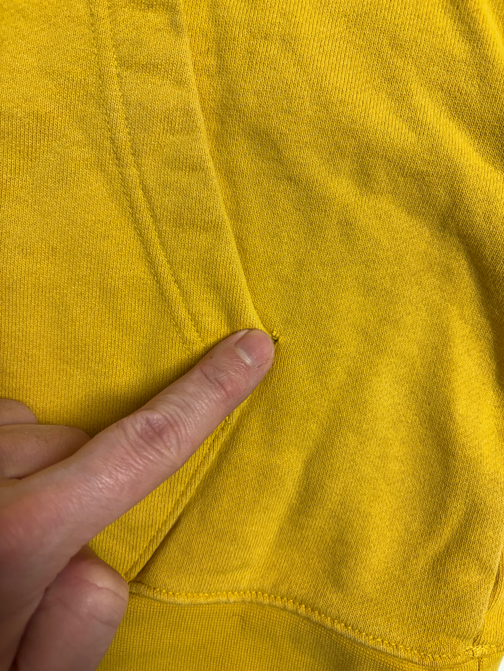 25" L, 20.5" W, 22" L sleeves from shoulder seam. 100% Cotton. Small hole on pouch seam (see photo).