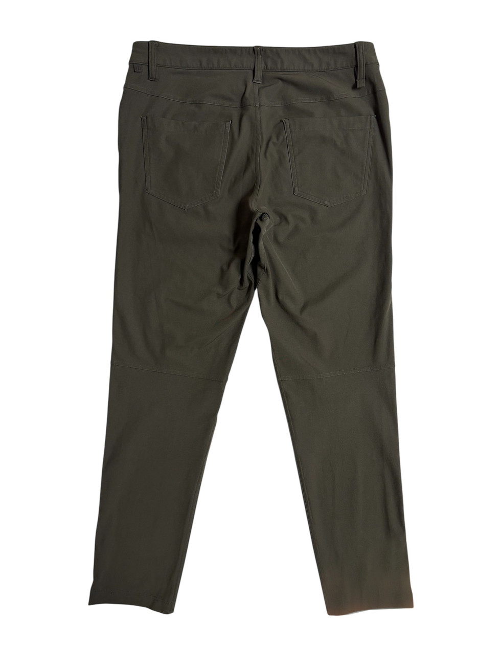 37" L, 28.5" inseam, 10" rise, 16" W waist. No materials tag, but likely elastaine. No size tag, but likely 32.