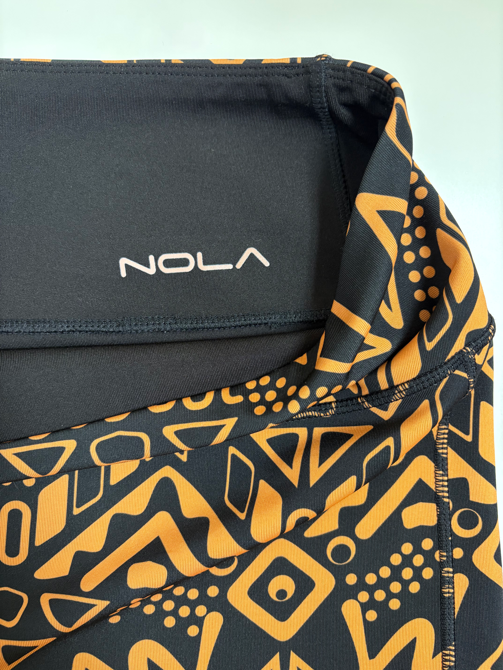 Nola Athletic Black Capri Pants with Orange Print Design.