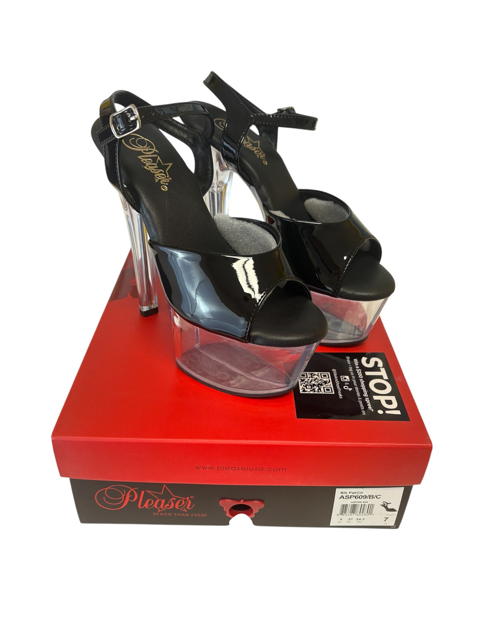 6" Heel, 2.25" Front Platform, Patent Black Leather, Clear Acrylic.